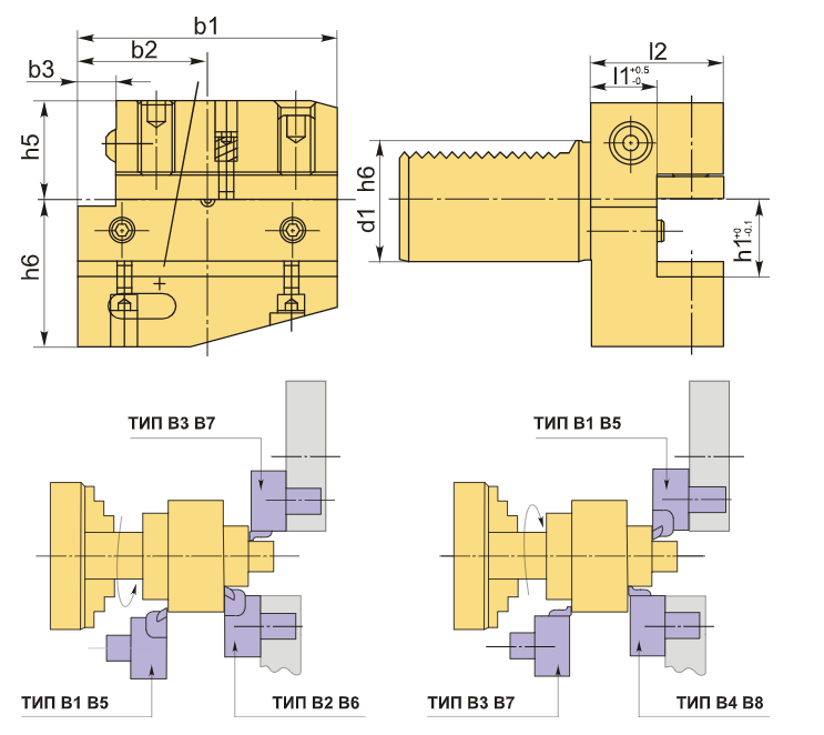 Инструментальный блок VDI40 типа B2 предназначен для резцов с прямоугольным сечением. Этот блок служит для наружной державки (оправок VDI) и применяется при наружной продольной обработке и торцевом точении. Установка резца осуществляется с пластиной вверх, а его опорная поверхность располагается ниже оси центров.