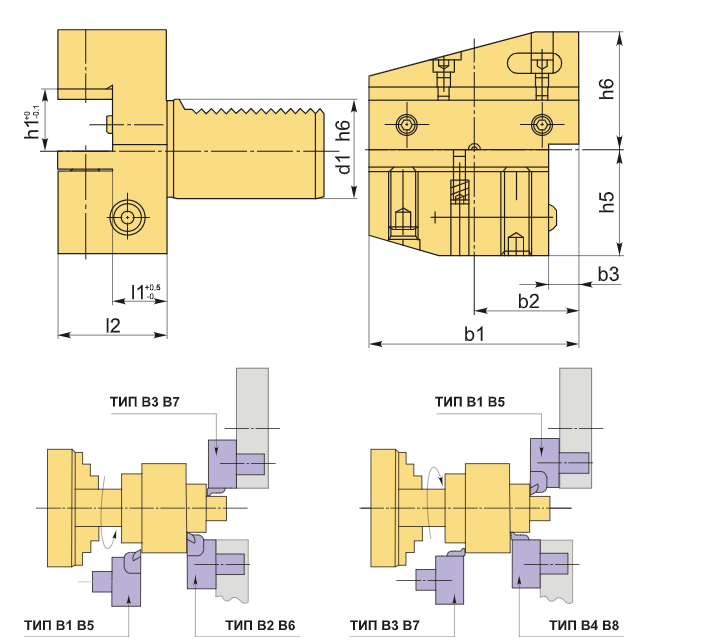 Резцедержатель VDI40 типа B3, правый, радиальный и обратный, относится к укороченной серии. Его базовая опорная поверхность находится выше оси центров, что создает удобные условия для радиального и продольного наружного точения. Высота h1 составляет 20 мм без проставки и 16 мм с проставкой.
