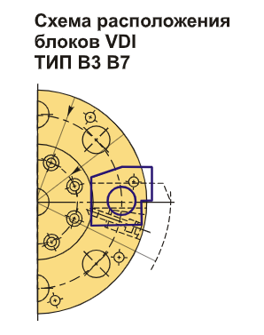 Инструментальный блок VDI40 типа B3 предназначен для резцов с прямоугольным сечением. Он применяется для наружной продольной и торцевой обработки. Резец устанавливается пластиной вниз, при этом его опорная поверхность располагается выше оси центров.