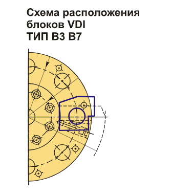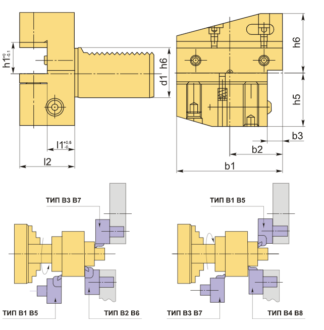 Инструментальный блок VDI40 типа B3 разработан для резцов с прямоугольным сечением. Такой вид оправки используется для наружной продольной обработки и торцевого точения. Резец устанавливается вниз пластиной, а его опорная поверхность располагается выше оси центров.